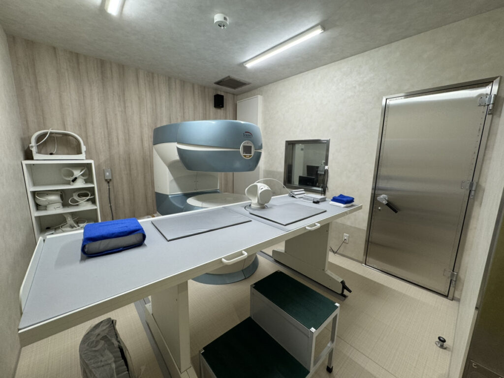 そこで当院が導入しているのが、左右が開いて視界が広い“オープン型(開放型)MRI”です。トンネル型(筒状)とは異なる開放的な構造により、狭い空間に入らずに検査を受けられるため、圧迫感や不安感がぐっと和らぎます。写真に写っているのは実際の当院のMRI室です。