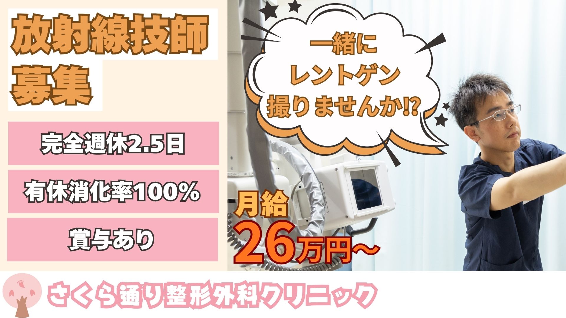 こんにちは。さくら通り整形外科クリニックの院長です。当院では、患者様に高品質な診断と治療を提供するため、新たに放射線技師を採用する求人を行っています。放射線技師として、あなたの専門知識と技術を活かし、患者様の診断精度を高め、最適な治療方針の決定に貢献していただきたいと考えています。
